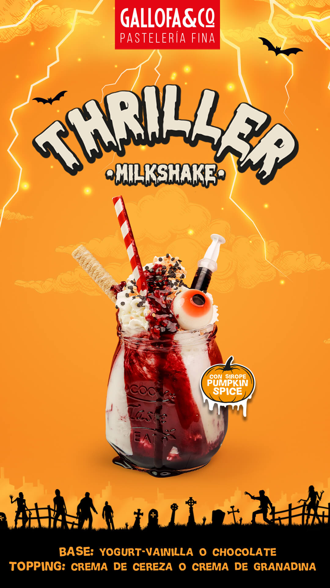 También te recordamos que en todos nuestros establecimientos Gallofa & Co, podrás degustar el batido más HOT del momento: nuestro batido Thriller creado para esta edición. Con una base que podrás elegir entre chocolate, vainilla o yogurt y su mix de toppins alucinantes chorreando sirope de pumpking spice ¿Te lo vas a perder?
